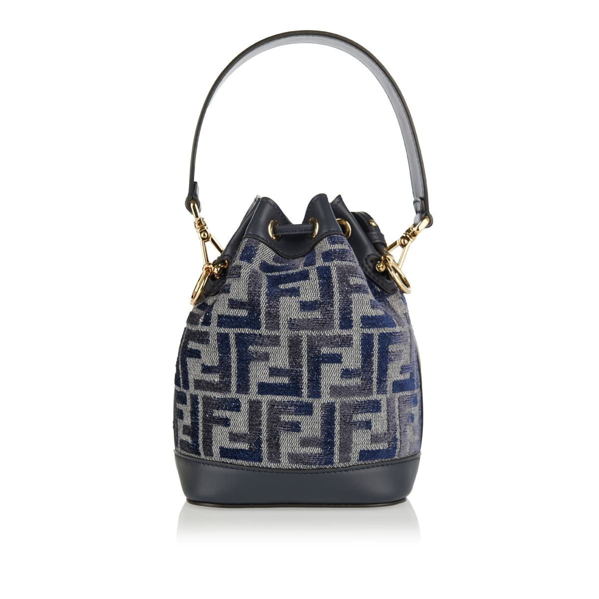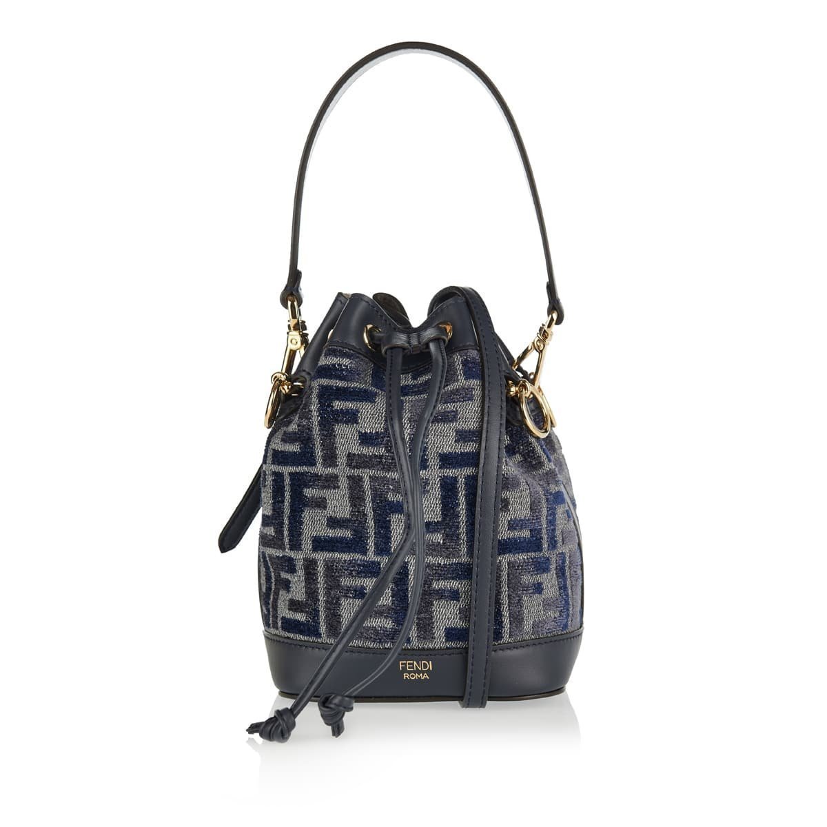 Αυτή η μπλε και γκρι τσάντα Mon Tresor είναι φτιαγμένη από ύφασμα σενίλ και είναι κεντημένη με το εικονίδιο FF της Fendi. Διακοσμημένο με δέρμα μαύρου τόνου, έχει διαμορφωθεί σε δομή μίνι κουβά που διαθέτει μία επάνω λαβή, κλείσιμο με κορδόνι περίσφιξης, μία θήκη και αφαιρούμενο λουρί. Είναι λεπτομερής με χρυσό μεταλλικό.
