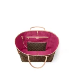 The Neverfull GM tote unites timeless design with heritage details. Made from supple Monogram canvas with natural cowhide trim, it is ultra-roomy but never bulky, with side laces that cinch for a sleek allure or loosen for a more casual look. Slim, comfortable handles slip easily over the shoulder or arm. Lined in colorful textile, it features a removable pouch which can serve as a clutch or an extra pocket.
